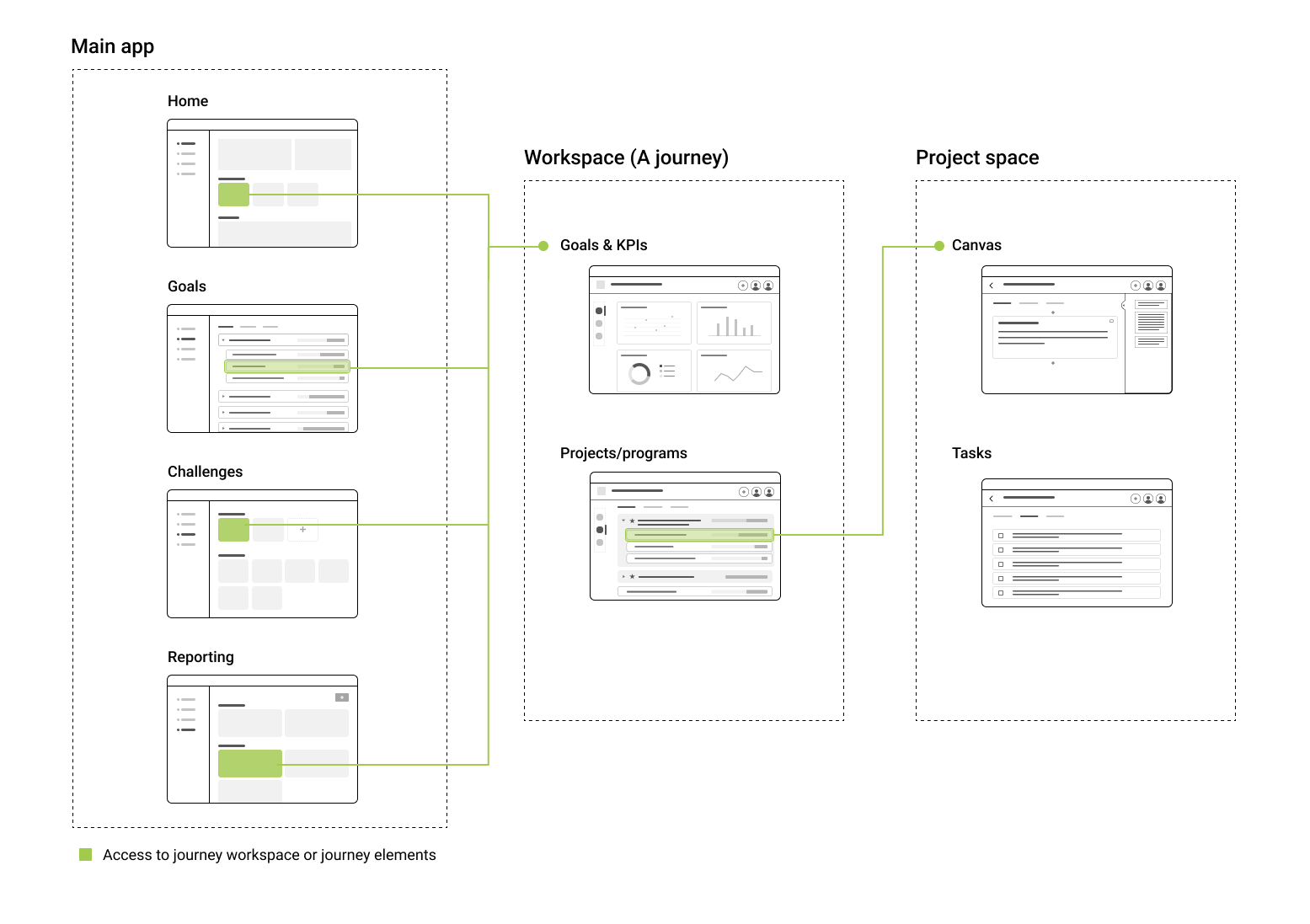 “Journey” architecture map with a focus on solving how the journey elements could be easily accessed across the main app.